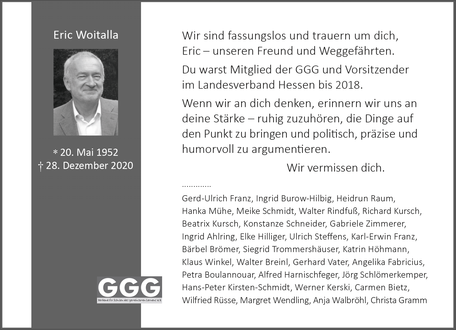 Wir sind fassungslos und trauern um dich, Eric - unseren Freund und Weggefährten.